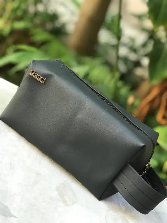 Necessaire masculina em couro sintético preto, com alça de mão e design sofisticado. Ideal para organizar itens pessoais com estilo e praticidade.
